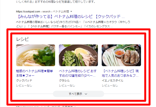 また、リッチリザルトがない場合に比べ、ユーザーの目に留まりやすくなるため、クリック率向上が期待できます。